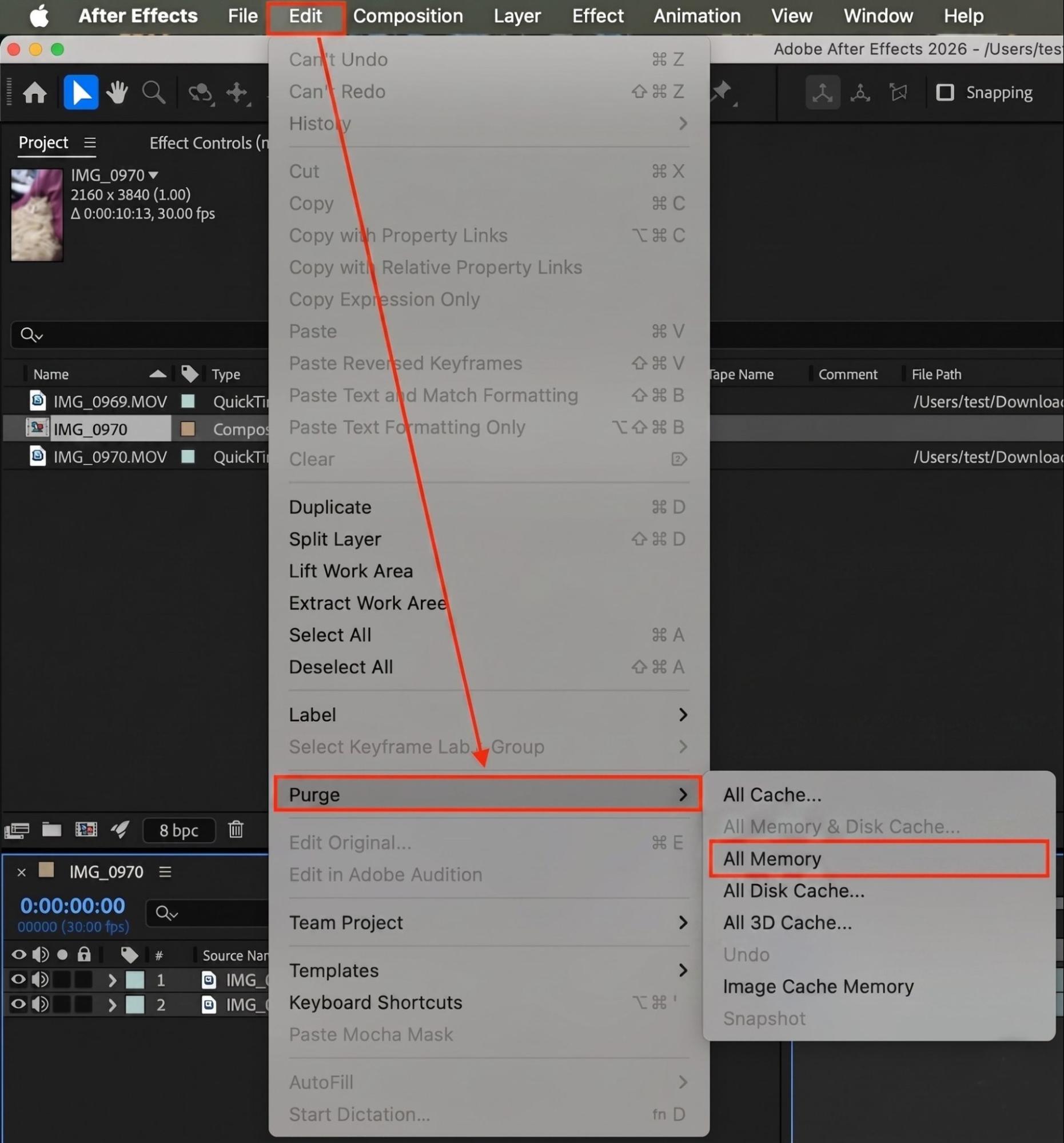 Adobe After Effects also provides a quick purge option from the menu bar that clears both RAM and disk cache at once. To use this method, follow our instructions below: