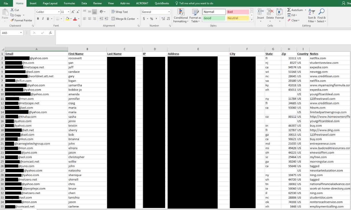 Through offers such as credit checks, education opportunities, and sweepstakes, this spam operation has gathered and conglomerated a database of 1.4 billion peoples’ email accounts, full names, IP addresses, and often physical address. There is evidence that similar organizations have contributed to this collection. An active market exists for trafficking in these types of lists for illegitimate purposes.