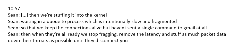 In that screenshot, a RCM co-conspirator describes a technique in which the spammer seeks to open as many connections as possible between themselves and a Gmail server. This is done by purposefully configuring your own machine to send response packets extremely slowly, and in a fragmented manner, while constantly requesting more connections.