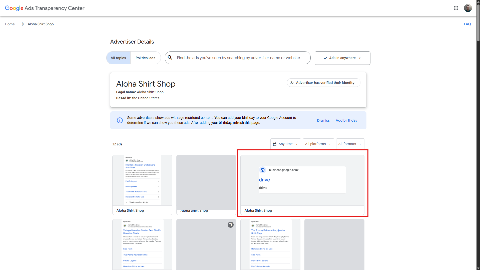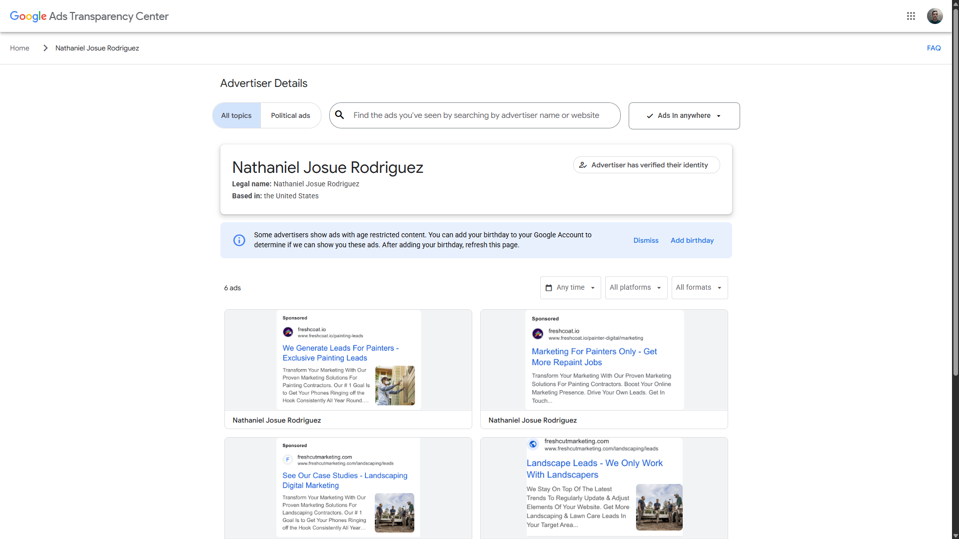 After investigating the above-mentioned ads and landing pages, we took a look at advertisers (which are verified by Google), so it appears like these Google Ads accounts were hacked.
