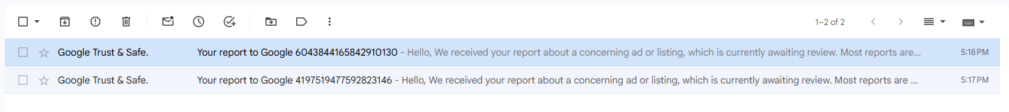 However, the Transparency Center shows only ads for other domains, which are fine.