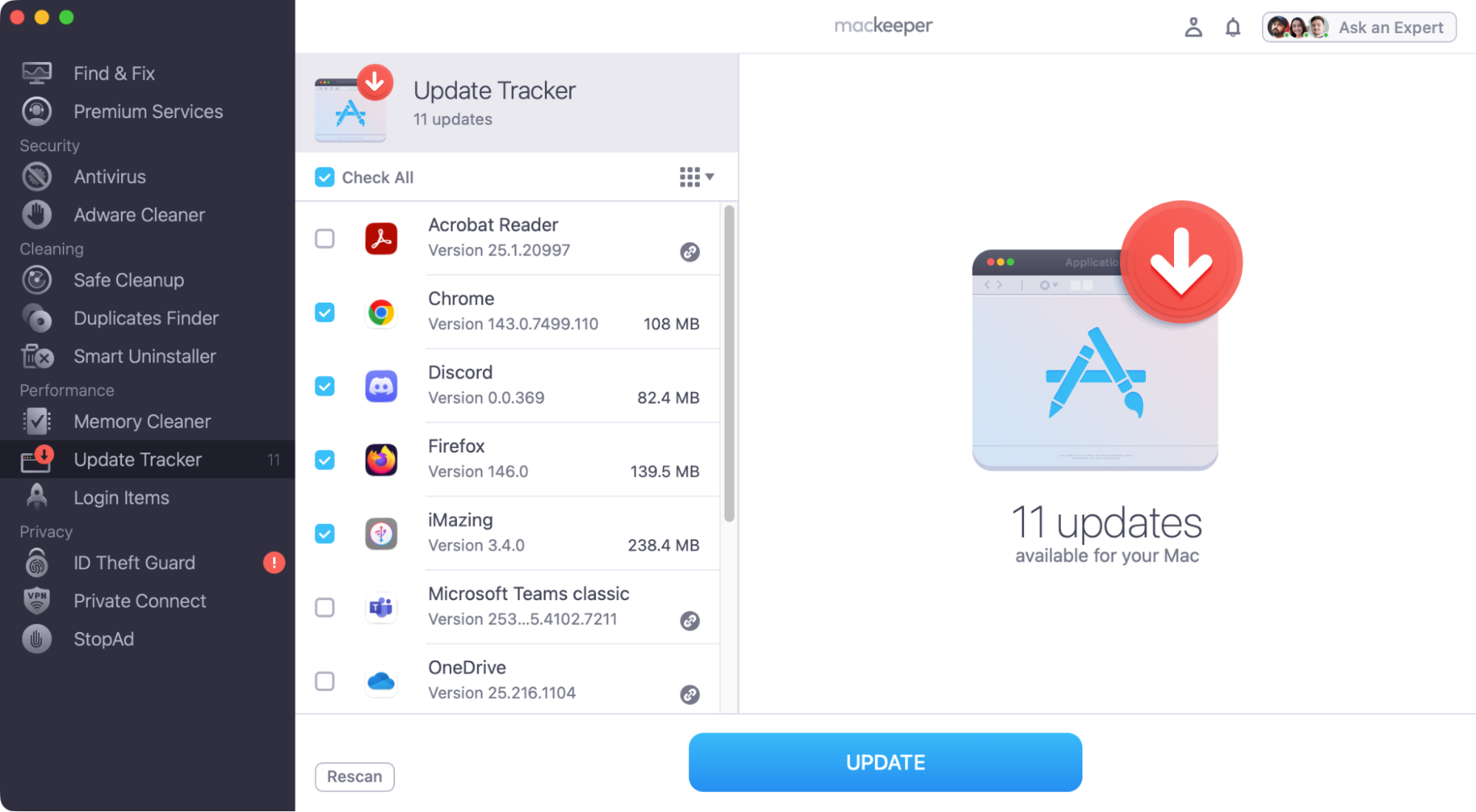 You should keep all your third-party apps up to date, but particularly video and audio apps if you’re having VTDecoderXPCService CPU issues. You can manually check all your apps, but if you want to save time, use MacKeeper’s Update Tracker: