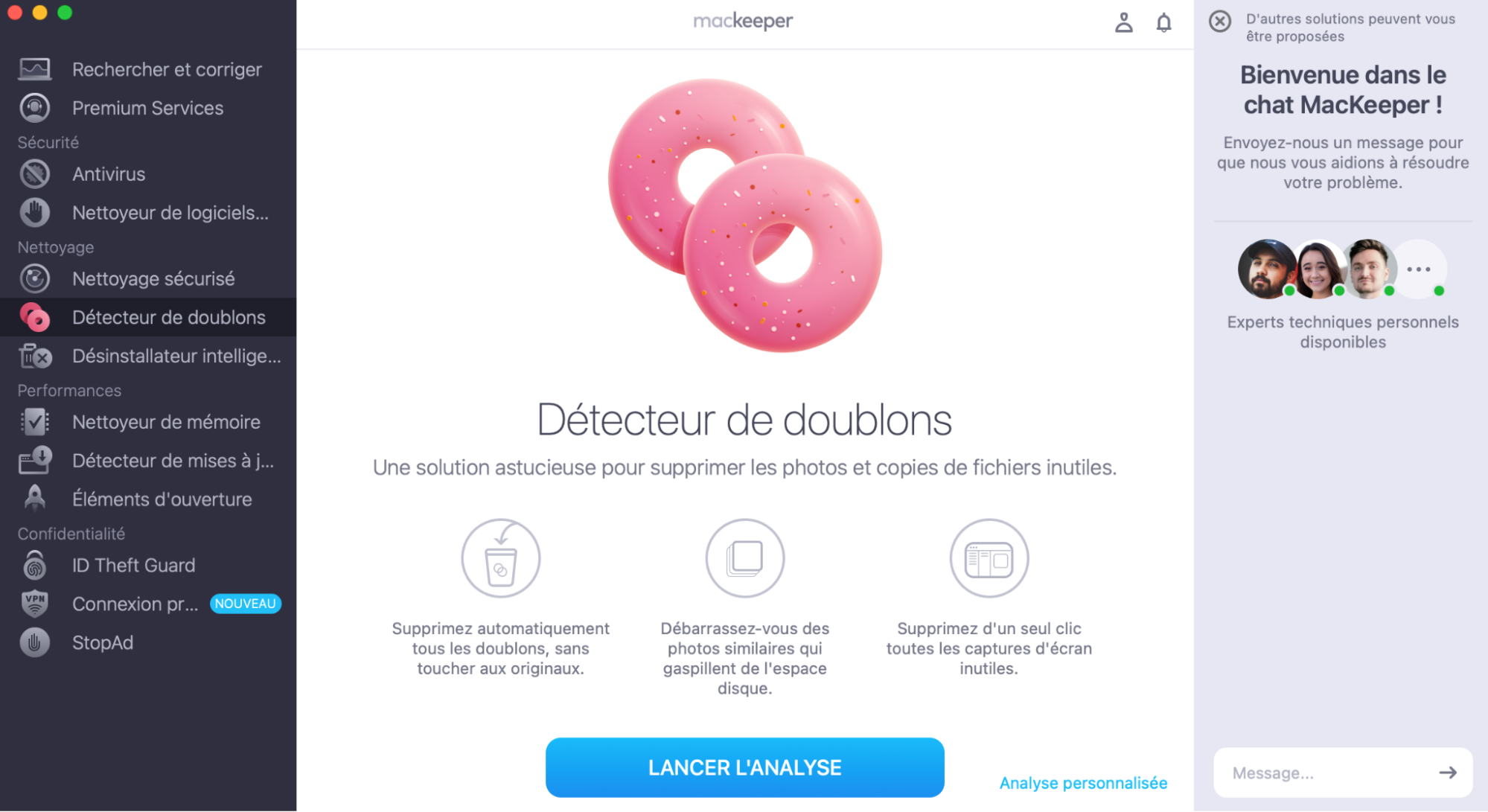 Étape 1. MacKeeper > Détecteur de doublons > Lancer l’analyseÉtape 2. Examinez la liste de doublons et choisissez lesquels supprimer > cliquez sur Supprimer les objets sélectionnés
