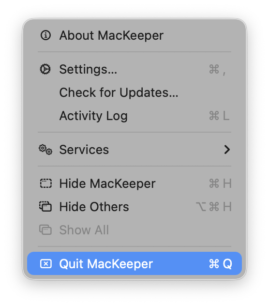 1. Quit MacKeeper. Press and hold Command (⌘) and Q or navigate to the top-left menu.